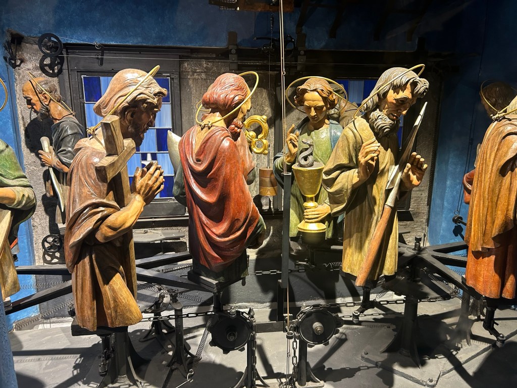 Ogni ora, dalle 9 del mattino alle 9 di sera, le figure dell’orologio prendono vita, offrendo uno spettacolo che affascina i presenti. Le dodici figure apostoliche si muovono lentamente attraverso le finestre superiori, mentre in basso si svolge un vero e proprio spettacolo di marionette che rappresenta il mondo terreno.