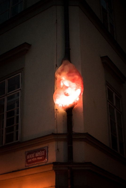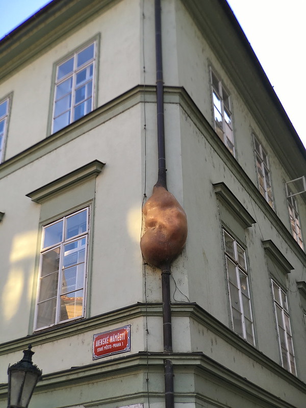 In un suggestivo angolo di Praga 1, quasi nascosta, la scultura ‘Embryo’ di David Černý si attacca con audacia ad una grondaia su un edificio, proprio vicino al rinomato teatro Na zábradlí (Divadlo Na zábradlí, Anenské náměstí, Praha 1).