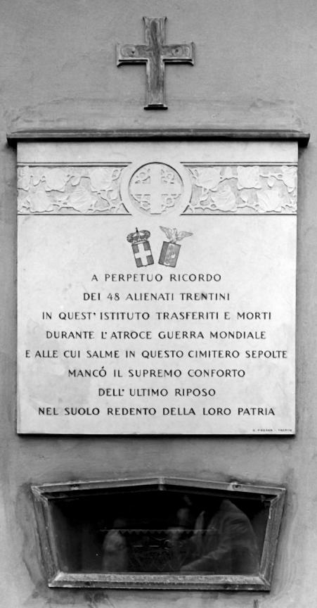 Sotto la lapide furono collocate delle cassette di rame contenenti la terra del cimitero Trento, a ricordo del suolo della propria patria. Per la cronaca, i profughi italiani affetti da malattie psichiatriche trasporti dal Trentino a Praga furono 281.