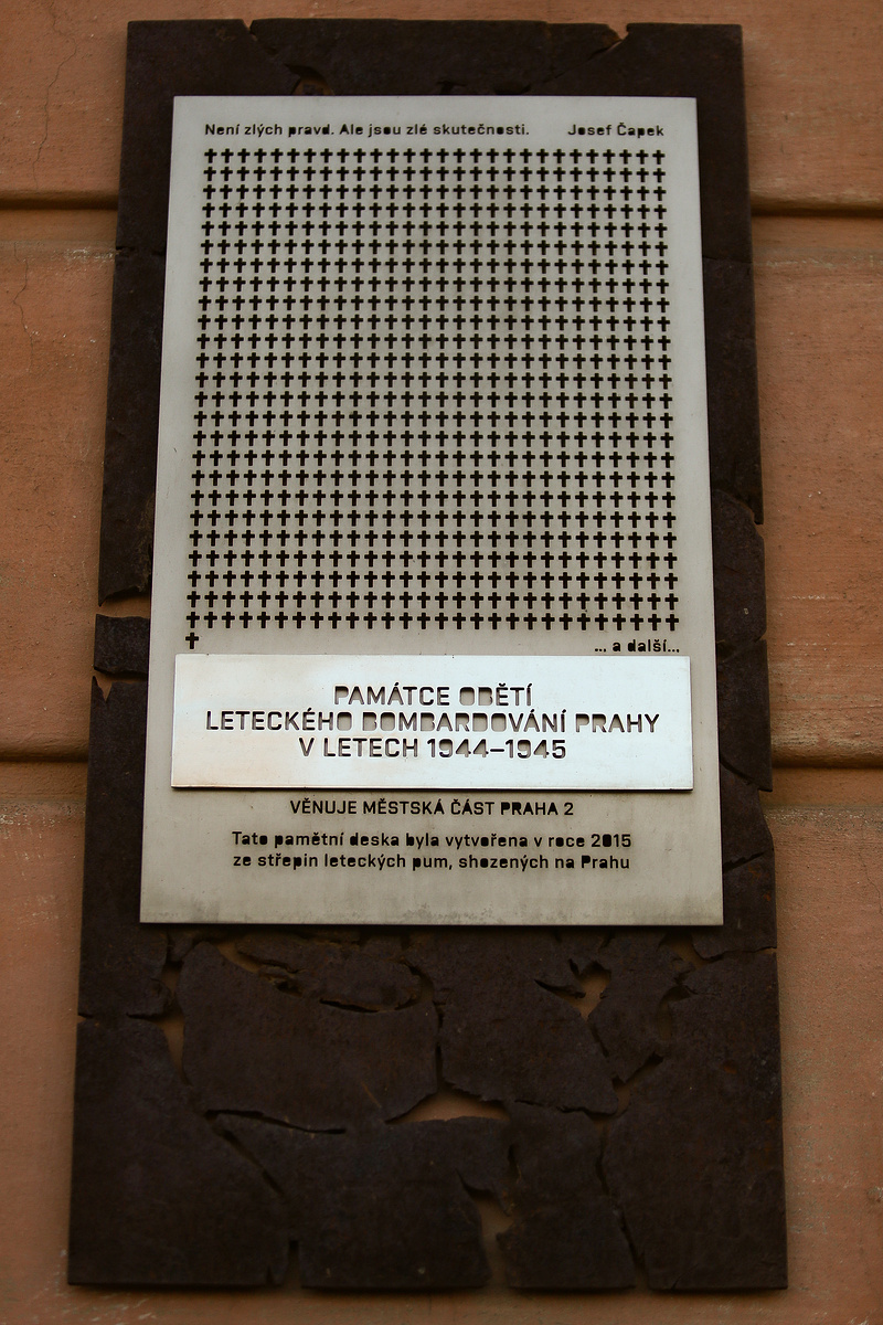 Presso l’ospedale in Karlovo náměstí, per la precisione sulla Všeobecné fakultní nemocnice, si trova una lapide commemorativa creata nel 2015 dallo scultore Petr Císařovský a ricordo del bombardamento del febbraio 1945, costruita con i residui delle bombe cadute sulla città. Non lontano da questa località si trovava uno dei più grandi rifugi antiaerei, che fu colpito da una bomba provocando la morte di oltre 130 persone, prevalentemente donne e bambini.