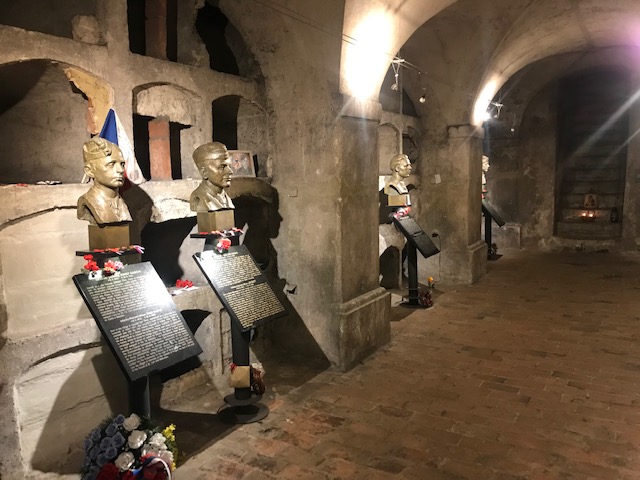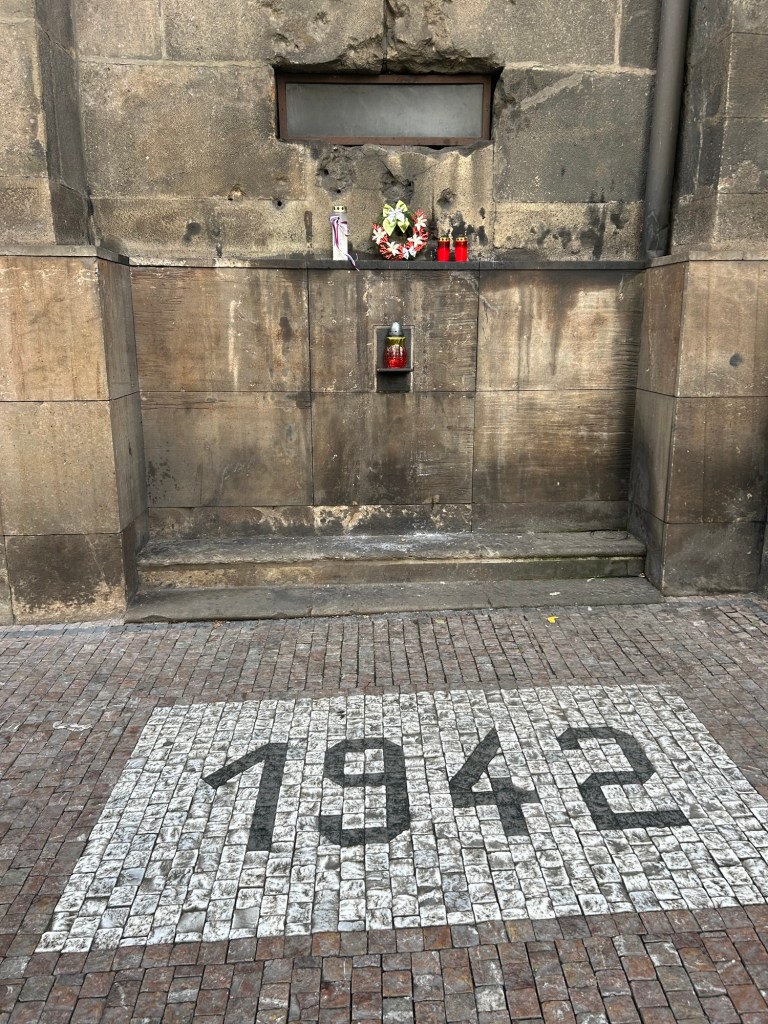 Presso l’ospedale in Karlovo náměstí, per la precisione sulla Všeobecné fakultní nemocnice, si trova una lapide commemorativa creata nel 2015 dallo scultore Petr Císařovský a ricordo del bombardamento del febbraio 1945, costruita con i residui delle bombe cadute sulla città. Non lontano da questa località si trovava uno dei più grandi rifugi antiaerei, che fu colpito da una bomba provocando la morte di oltre 130 persone, prevalentemente donne e bambini.